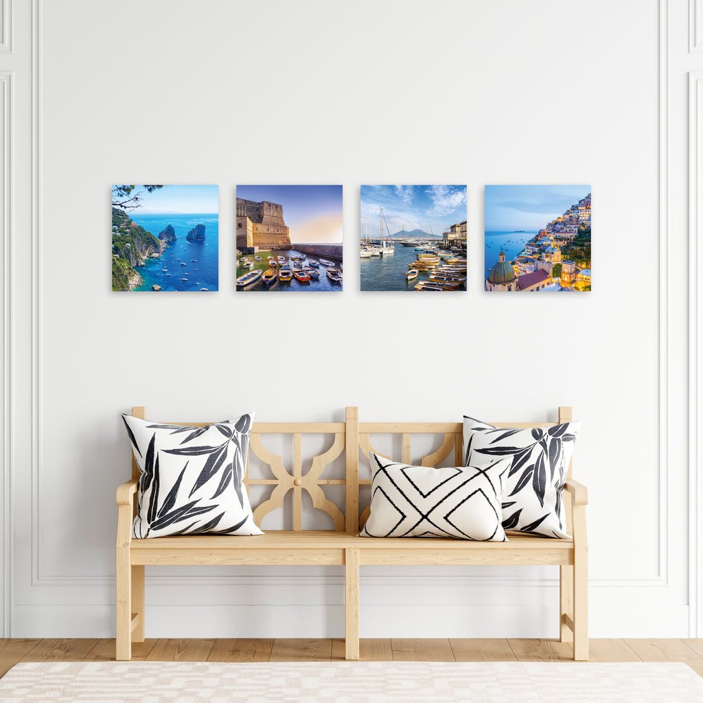 Quadri Stampa su Tela con Telaio in Legno 4 pezzi Panorama Napoli, Costiera Amalfitana, Capri