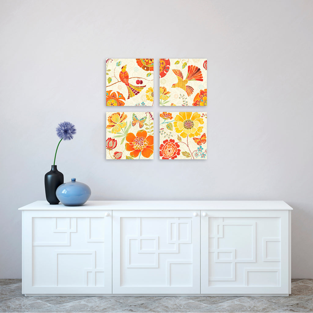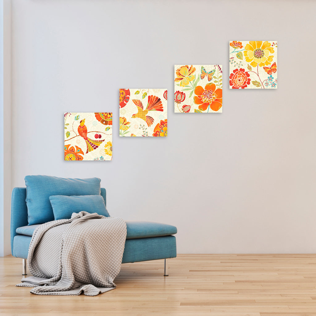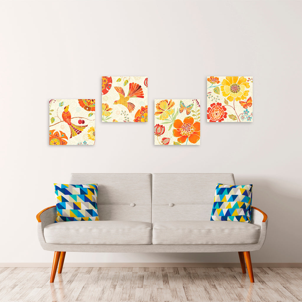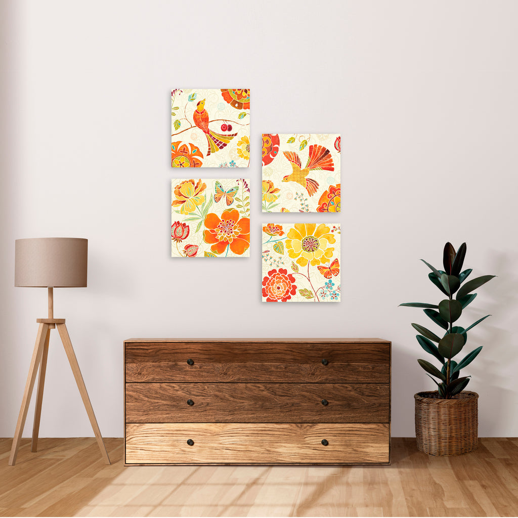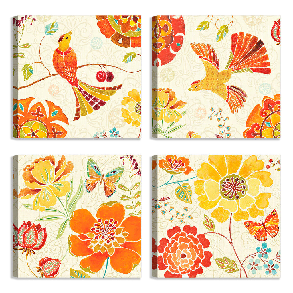 Quadri Stampa su Tela con Telaio in Legno 4 pezzi Uccellini, fiori e farfalle in stile elegante