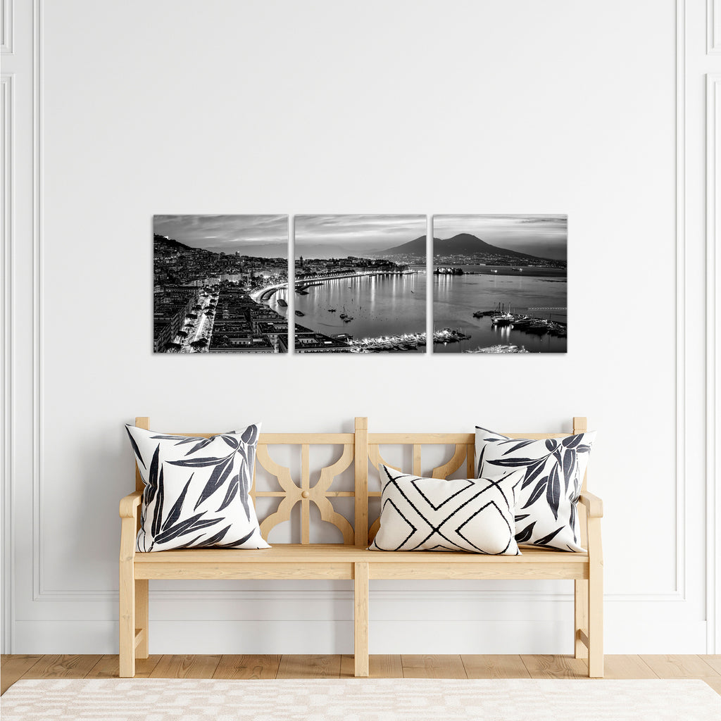 Quadri Stampa su Tela con Telaio in Legno 3 pezzi Panorama Napoli Vesuvio in bianco e nero