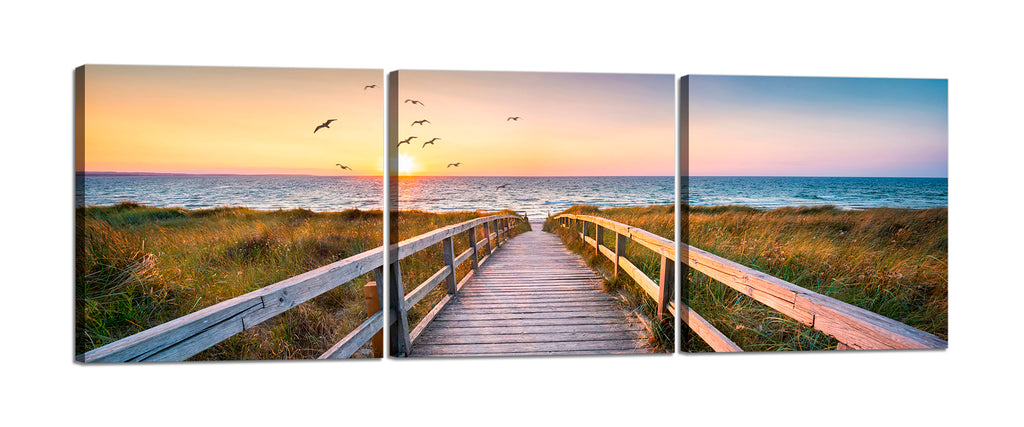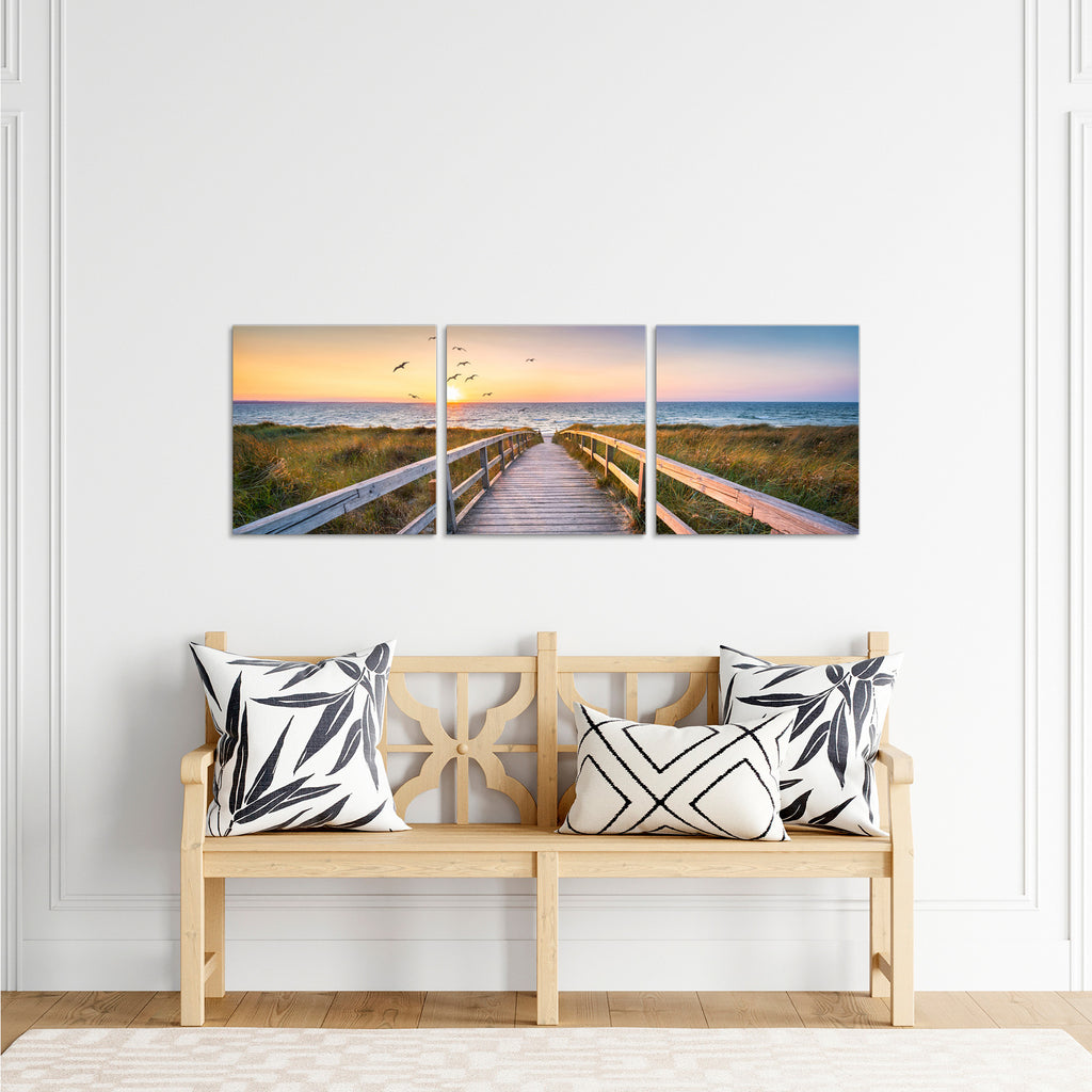 Quadri Stampa su Tela con Telaio in Legno 3 pezzi Passerella sul mare al tramonto