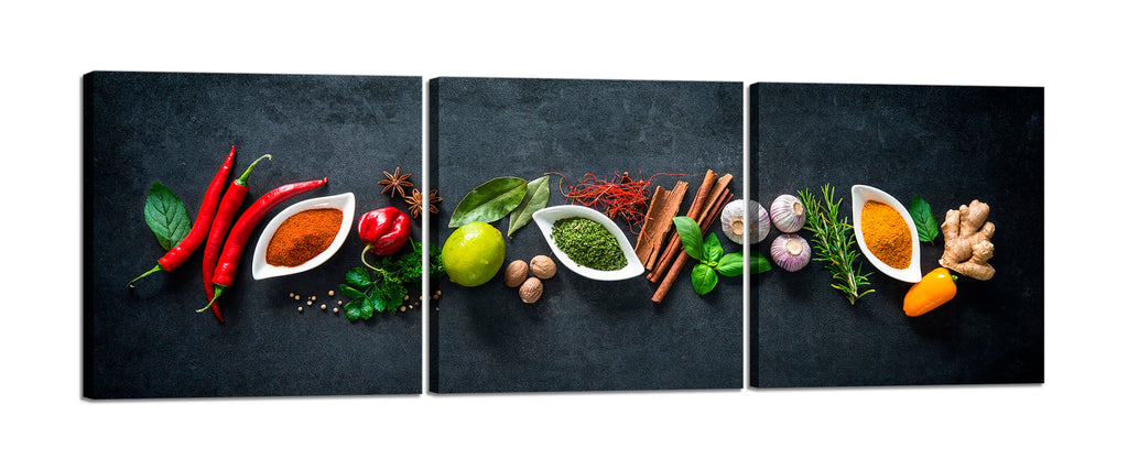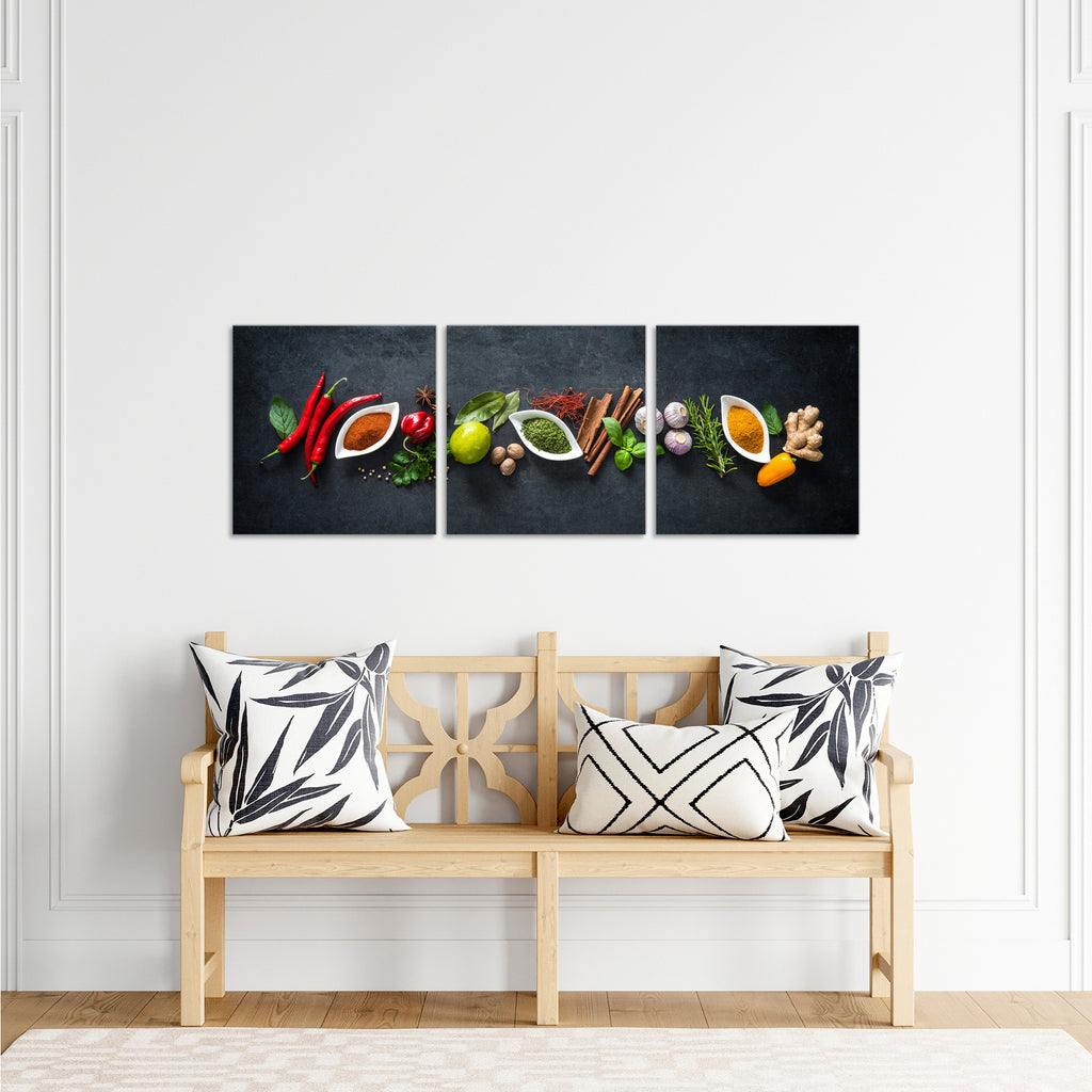 Quadri Stampa su Tela con Telaio in Legno 3 pezzi Spezie per cucina su sfondo nero