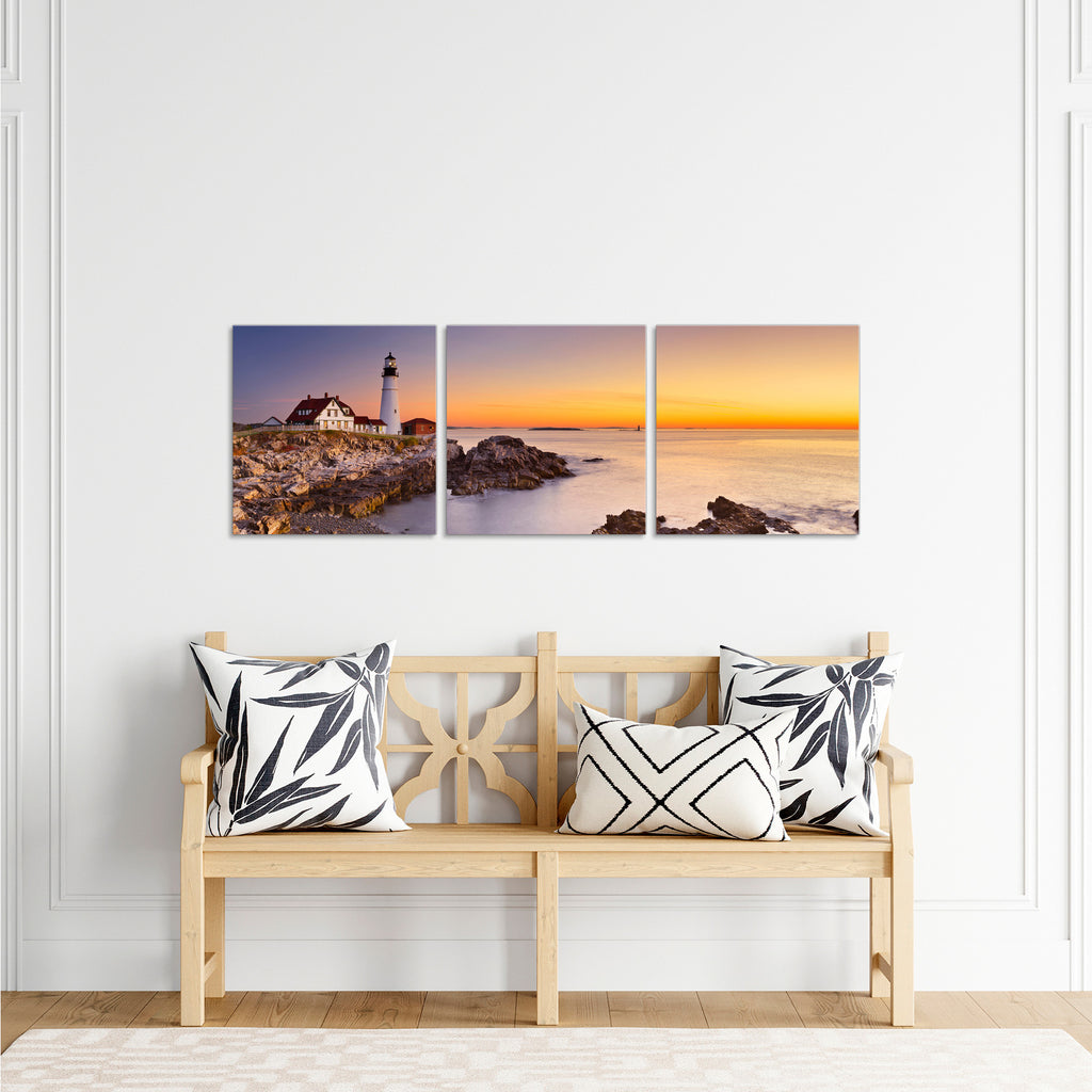 Quadri Stampa su Tela con Telaio in Legno 3 pezzi Tramonto al mare con faro