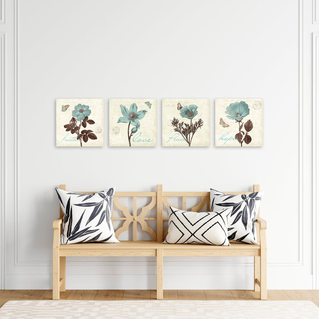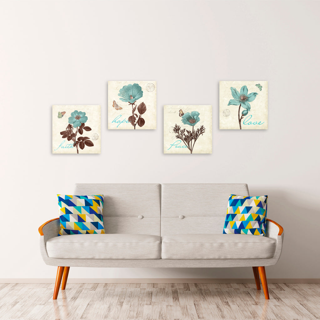 Quadri Stampa su Tela con Telaio in Legno 4 pezzi Fiori con frasi: Love, Peace, Faith, Hope