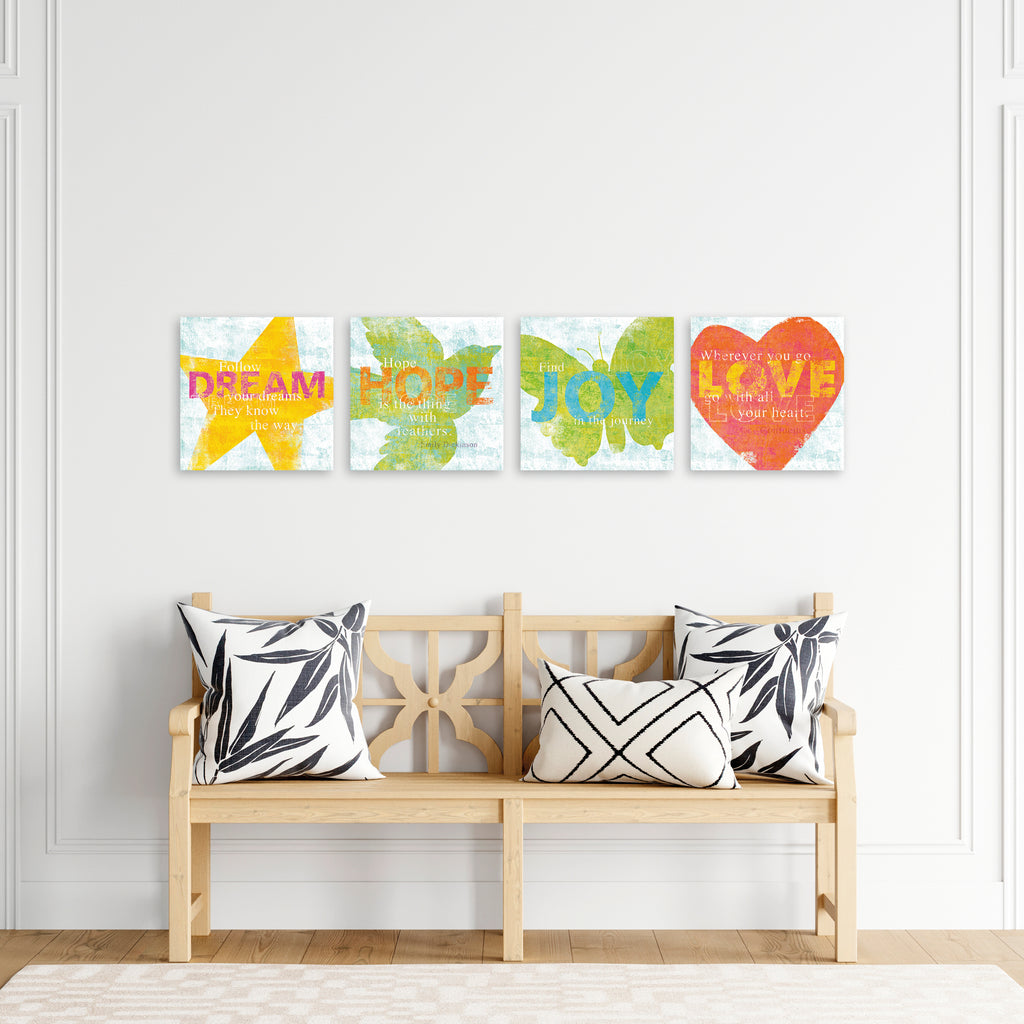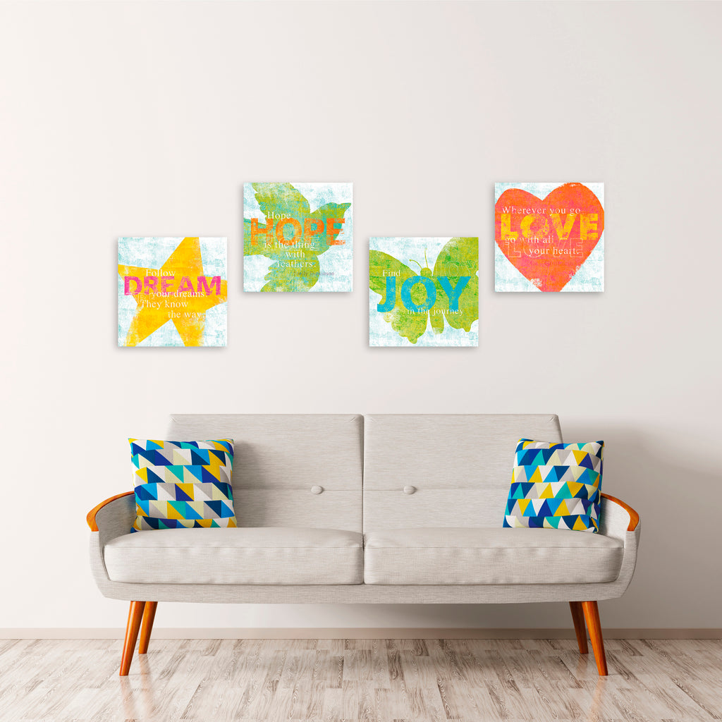Quadri Stampa su Tela con Telaio in Legno 4 pezzi Frasi positive, Love, Hope, Joy, Dream